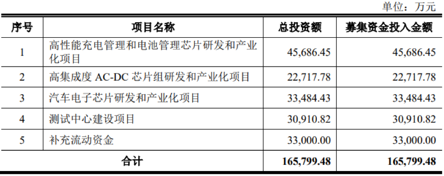 募資用途:此次IPO擬募資16.58億元,用于高性能充電管理和電池管理芯片研發(fā)和產(chǎn)業(yè)化項(xiàng)目、高集成度AC-DC芯片組研發(fā)和產(chǎn)業(yè)化項(xiàng)目、汽車電子芯片研發(fā)和產(chǎn)業(yè)化項(xiàng)目、測試中心建設(shè)項(xiàng)目、補(bǔ)充流動資金。