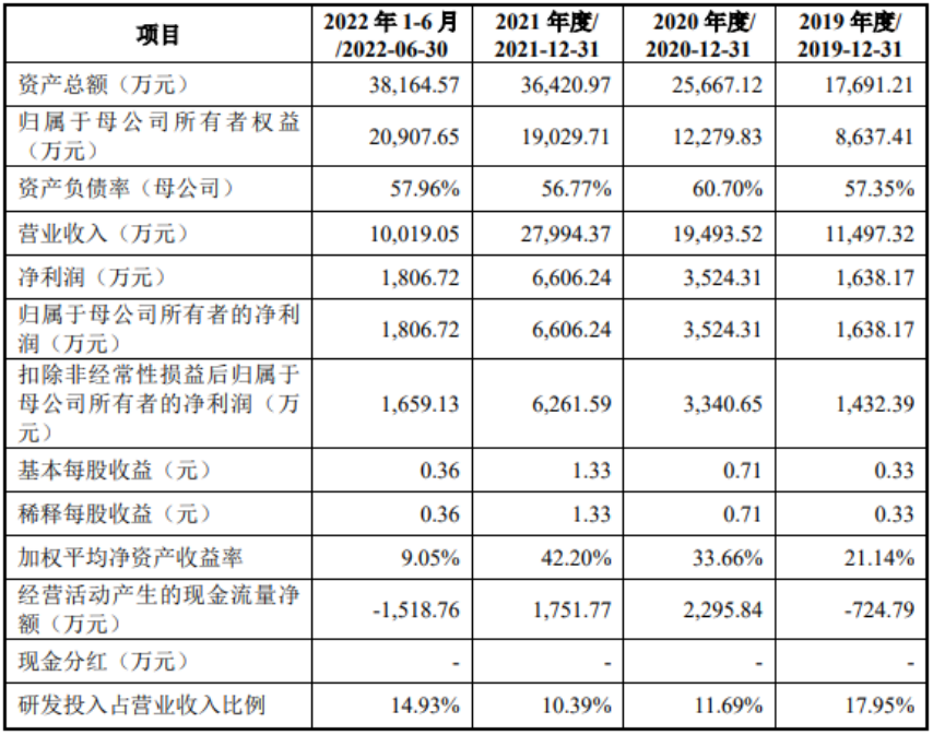 2019年至2022年1-6月,公司的營業(yè)收入分別為1.15億元、1.95億元、2.80億元和1.00億元;歸母凈利潤分別為1,638.17萬元、3,524.31萬元、6,606.24萬元、1,806.72萬元。