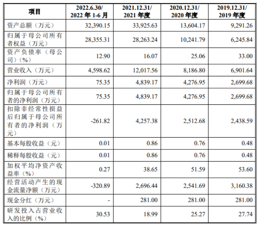 2019年至2022年1-6月,公司的營(yíng)業(yè)收入分別為6901.64萬(wàn)元、8186.80萬(wàn)元、1.20億元和4598.62萬(wàn)元;凈利潤(rùn)分別為2699.68萬(wàn)元、4276.95萬(wàn)元、4839.17萬(wàn)元和75.35萬(wàn)元。
