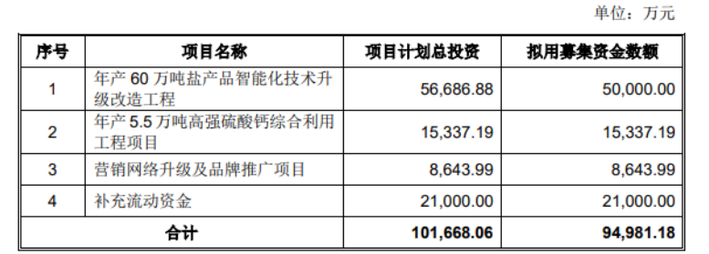 募資用途:此次IPO擬募集約9.50億元,用于年產(chǎn) 60萬噸鹽產(chǎn)品智能化技術(shù)升級改造工程、年產(chǎn)5.5萬噸高強硫酸鈣綜合利用工程項目、營銷網(wǎng)絡(luò)升級及品牌推廣項目、補充流動資金。