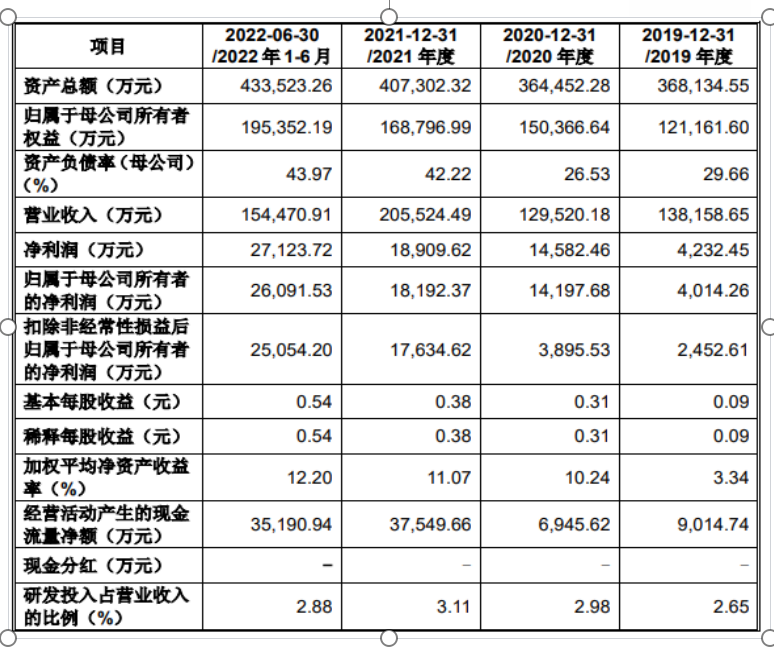 2019年至2022年1-6月,公司營業(yè)收入分別為13.82億元、12.95億元、20.55億元、15.45億元,歸母凈利潤分別為4014.26萬元、1.42億元、1.82億元、2.61億元。