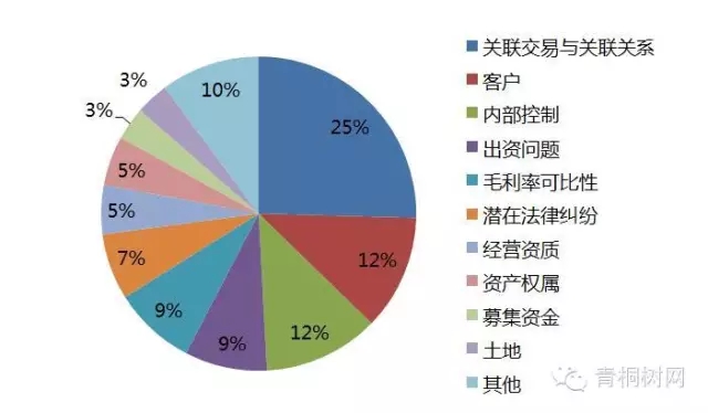 青桐樹網(wǎng)統(tǒng)計(jì)了上述規(guī)范性問題的具體類型。其中,關(guān)聯(lián)關(guān)系及關(guān)聯(lián)交易相關(guān)問題受關(guān)注程度最高,占規(guī)范性問題總數(shù)的25%,客戶與內(nèi)部控制相關(guān)問題所占比重次之,均占12%。其他問題詳細(xì)比重如下: