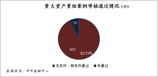 2008年至2016年一季度,證監(jiān)會并購重組委審核了1010個重大資產(chǎn)重組案例。其中無條件、有條件通過的案例有937個,未予通過的案例有73個,審核通過率超90%,可見監(jiān)管層對于并購重組、再融資持認(rèn)可態(tài)度,鼓勵、支持上市公司通過并購重組做大做強(qiáng)。
