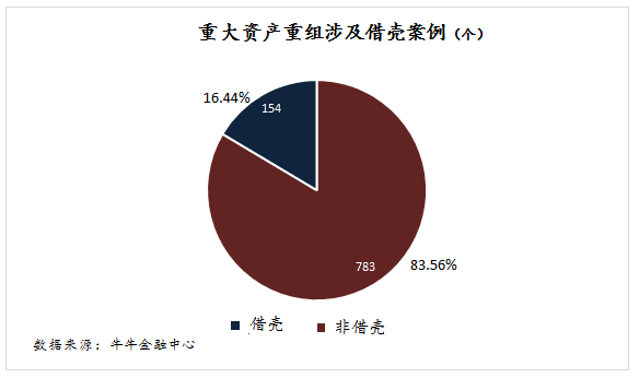 牛牛金融中心根據(jù)證監(jiān)會審核的有條件、無條件通過的937個上市公司重大資產(chǎn)重組案例,逐一篩選出涉及借殼行為的例子154例,占所有審核通過案例的16.44%,可見借殼成了上市的重要途徑之一,這些不規(guī)避借殼條件的公司非常值得贊揚(yáng)。據(jù)不完全統(tǒng)計(jì),若算上通過各種途徑繞開借殼的公司,那么構(gòu)成借殼上市的案例比例或超30%。