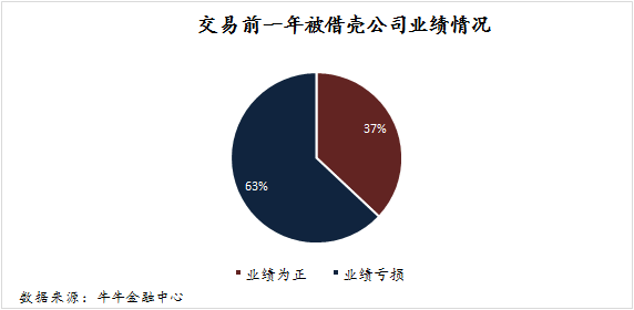 如下圖所示,被借殼前一年超6成上市公司業(yè)績普遍低迷,為虧損狀態(tài)。因并購重組方案從預(yù)案到證監(jiān)會審核通過,再到完成實(shí)施一般需要經(jīng)過2-3年時間,可能在雙方洽談時上市公司已經(jīng)連續(xù)虧損數(shù)年,但到完成借殼重組前一年因各種原因業(yè)績轉(zhuǎn)正。所以該數(shù)據(jù)為保守數(shù)據(jù),即被借殼方業(yè)績虧損比例或超7成。