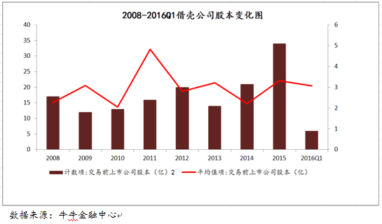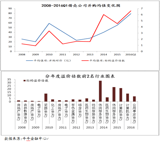 2008年至2016年Q1,據(jù)牛牛金融研究中心統(tǒng)計(jì),借殼方并購對價均值從26.10億元增長到2016年Q1的79.35億元,年復(fù)合增長率達(dá)到10.33%,而A股從08年最高點(diǎn)5522.78跌到如今的2821.67點(diǎn),跌幅已近一半。上圖顯示出借殼公司溢價倍數(shù)與其并購均值呈現(xiàn)出高度的正相關(guān)關(guān)系,并相繼于2010年與2014年達(dá)到局部峰值。