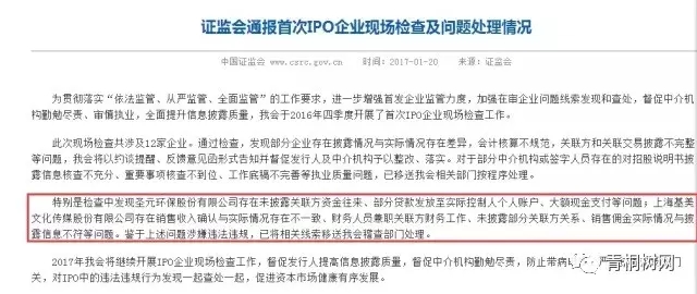 證監(jiān)會(huì)張曉軍2017年1月2日通報(bào)對(duì)首次IPO企業(yè)現(xiàn)場(chǎng)檢查情況。