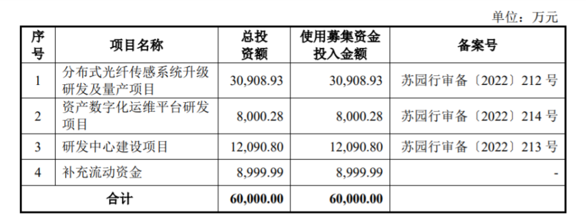 募資用途:此次IPO擬募資6億元,用于分布式光纖傳感系統(tǒng)升級研發(fā)及量產(chǎn)項目、資產(chǎn)數(shù)字化運維平臺研發(fā)項目、研發(fā)中心建設(shè)項目、補充流動資金。
