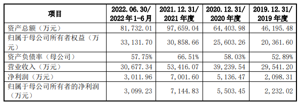 2019年至2022年1-6月,公司的營業(yè)收入分別為2.95億元、3.92億元、5.34億元、3.07億元;歸母凈利潤分別為2232.02萬元、5503.45萬元、7144.83萬元、3099.23萬元。