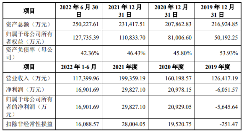 2019年至2022年1-6月,公司的營業(yè)收入分別為12.64億元、16.02億元、19.94億元和11.74億元;歸母凈利潤分別為-5,645.64萬元、20,929.05萬元、29,827.10萬元和16,901.69萬元。