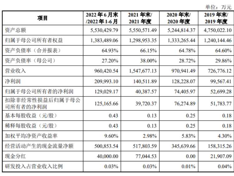 財務(wù)數(shù)據(jù):2019年至2022年1-6月,公司營業(yè)收入分別為72.68億元、97.09億元、154.77億元和96.04億元,凈利潤分別為9.96億元、12.82億元、14.05億元和21.00億元。